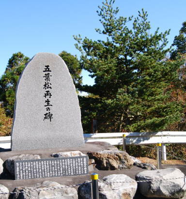 山頂近くに立つ「五葉松再生の碑」と五葉松巨樹地跡付近に植栽された「ヤクタネゴヨウ」 |