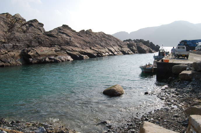 静かな佇まいを見せる天然の入り江、船間漁港。 |