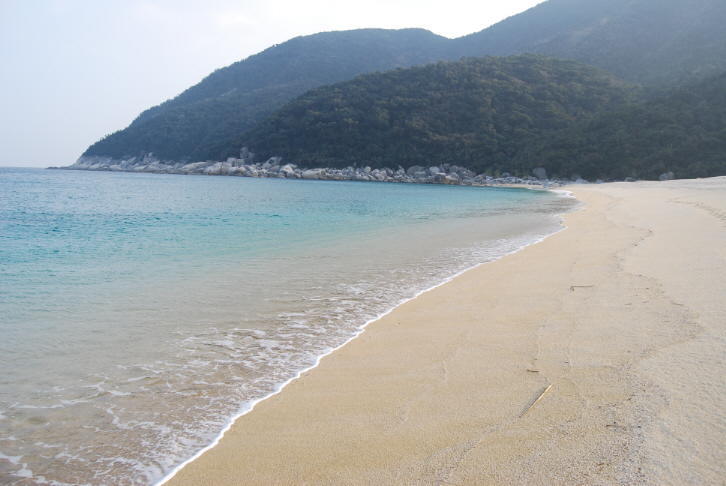 | 船間を過ぎて県道74号大浦線を南進すると辺塚に辿り着く。辺塚地区は三面を山で囲まれ、背地からは巨大な山が海岸線に沿ってなだれ込み、東方に向かって傾斜し、海に面している。平地は少なく船間から戸崎付近の丘陵を超えて辺塚に入るところに多少の平地があり、田畑が開けている。かつては陸の孤島と呼ばれた時代もあったが最近は交通網も整備され、利便性も増してきた。県道沿いの集落から、海岸に降り進むとギラギラする白い砂丘とコバルトブルーの海が目の前に広がり、壮観な太平洋が飛び込んでくる。山と海が織りなす手つかずの壮大な自然をここ、辺塚の海岸で目の当たりに見、体験することができる。辺塚海岸は海ガメの産卵地としても有名だ。探訪日 2009年2月12日 |
