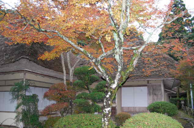 茶室と書院の様式を折衷した近世和風の茅葺き数奇屋建築の建物と色づいた紅葉 |