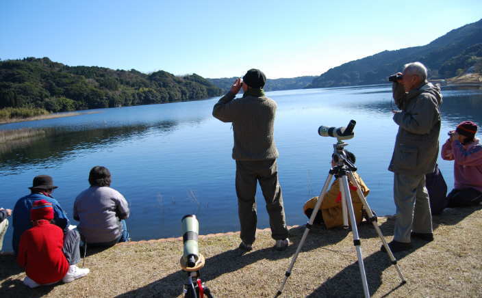 | 自然豊かな大隅湖は、春は桜、初夏はアジサイ、秋は紅葉、冬は渡り鳥の越冬地として知られ、訪れる人の目を楽しませてくれる。初冬の時期になるとカモをはじめとした冬鳥たちが湖上を賑わわせる。毎年1月3日は、大隅ブロック野鳥の会による大隅湖冬鳥の観察会が行われる。大隅湖の冬鳥はカモ類の種類や数が多いのが特徴だ。 |