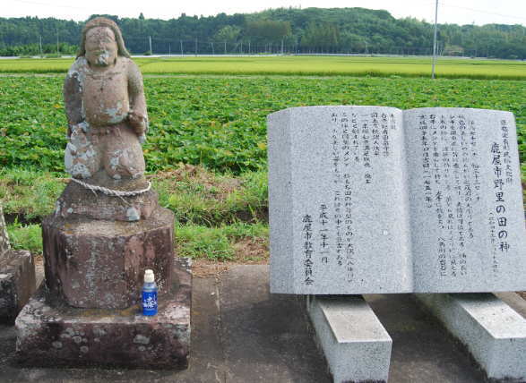 | 五穀豊じょうをもたらす農神として寛延4年(1751年)に建立された。柔らかい凝灰岩の丸彫りで、石台の上に両ひざで立ち頭にコシキをかぶり、右手にメシゲ、左手に鈴を持ち、表情は可憐である。この像と同型のメシゲ、鈴持ち田の神舞型のものが大隅に八体ほどあり、野里の田の神はその中でも最古とされる。県指定有形民俗文化財(昭和43年3月29日指定) |