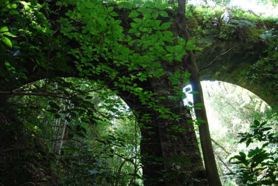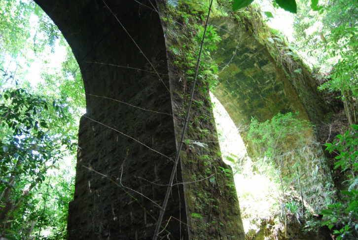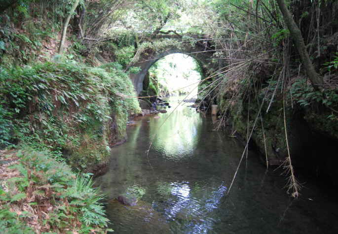 | 高須川水系には、貴重な石橋が残る。現在では老朽化が進み、上部をコンクリートで補強するなど改修が行われ、現在も住民の通行手段として利用されている。アーチ部分の石積みは建設当時の面影を伝えている。橋の周辺は雑木や竹林が生い茂り、早急な保存対策が望まれる。 |