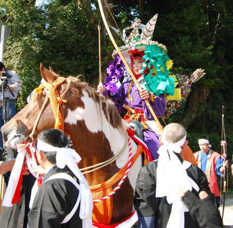 鎧武者、太刀持ち、的持ちなどを従えて町内を武者行列パレード、その後四十九所神社で祝詞奏上や神官から弓を受け取る「弓取り」の儀式などが行われる。 |