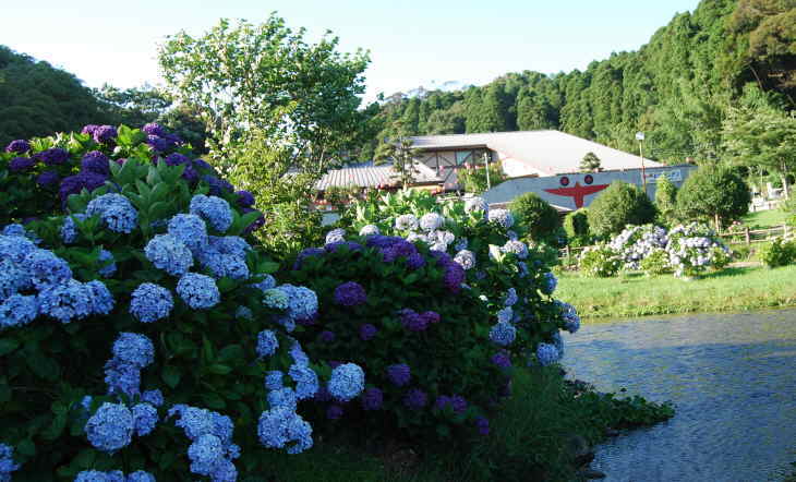 池の周りには約1000本のアジサイが植えられ、5月下旬から6月中旬にかけてあじさい祭りのイベントが開かれる。 |