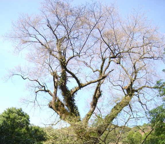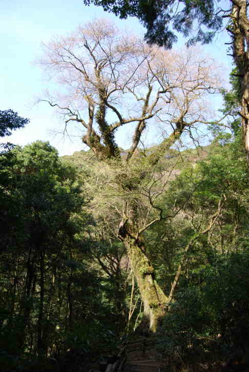 | 奥十曽の国有林にあるこのエドヒガン桜は、昭和52年8月に発見され、樹齢約600年、根回り21m、胸高周囲10.8m、樹高28mでエドヒガン桜の自生木としては、日本一のエドヒガン桜とされる。現地案内板には、「この江戸彼岸は、従来日本一とされていた、山梨県の神代桜を凌ぐ巨木で、南限地帯にあたり、学術的に貴重なため、昭和61年4月、周囲5.6ヘクタールが学術参考保護林に指定された。・・・」とある。国の「巨樹・巨木百選」、「森の巨人たち百選」にも選ばれている。エドヒガンザクラはバラ科、落葉の高木で高さ15mぐらいとなり、日本(本州から九州)と韓国の済州島、台湾に分布し、鹿児島県では栗野岳と奥十曽に産し、栗野岳のものは南限地として天然記念物に指定されている。 |