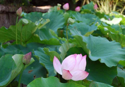 6月末から7月にかけて開花する大賀ハスは串良の夏の風物詩だ。町民会館前の小さな堀に咲く大賀ハス |