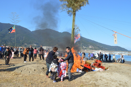 | 勢いよく燃え上がる火柱で、青竹が「ドンドン」とはじける度に「オー」と呼応する。 竹がはじける「爆音」で悪鬼を追い出し、火祭りの熱風を浴びると一年を通して健康に過ごせるという。 |
