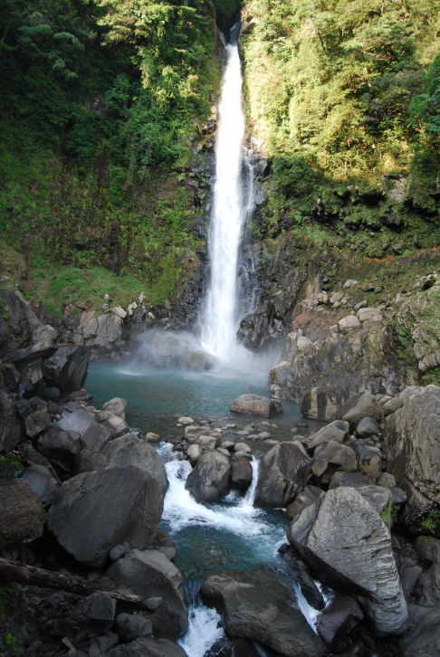 | 千里ヶ滝は、霧島川上流湯之野温泉近くの山深い渓谷にある。滝の特色は三段の滝で落差が75m(上段50m、中段20m、下段5m)と霧島山中で最も落差があり、水煙を上げながら一気に落ちる光景は圧巻だ。駐車場から急坂な歩道を約10分程進むと上段メイン滝の全景が見渡せる。時間と体力が許せば更に300m程下りた霧島第二発電所まで足を伸ばすと遊歩道橋から中段の滝、下段の滝が見渡せる。滝に向かう遊歩道一帯やまわりの山々は200年を超すと思われる赤松やモミ、ツガの針葉樹、スダジイやタブ等の照葉樹が幽玄で神秘的な雰囲気を醸し出している。探訪日 2010・9・14 |