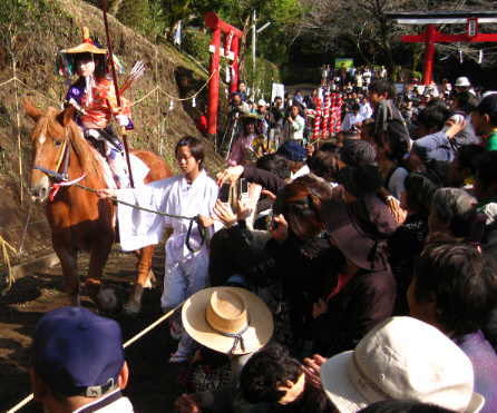 | 午後1時、神事の前儀が開始、本儀は2時からスタート。神事が終わると鳥居から神社に伸びる約二百数十メートルの参道を歩き清め、騎手は馬上にまたがり、場ならしと馬ならしのための試走をする。 |