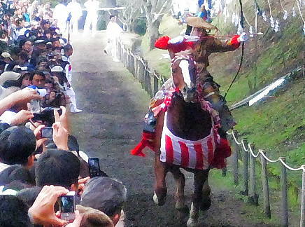 疾走する馬上から、的をめがけて矢が放たれる度に見物人から大喝采と拍手が上がる。射手3名、三ヶ所に設置された的を一人で3回射り、当たり数で豊作や運勢を占う。 |