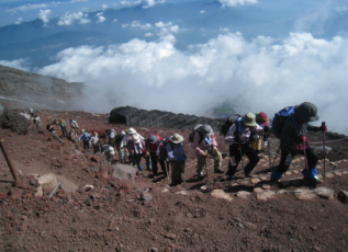 今後予想される登山者の増加は、オーバーユースの深刻な環境悪化を招く恐れがある。山小屋が満杯になり、宿泊できなくなると今まで以上に弾丸登山者が増え、そのことは高山病など個人の問題だけでなく、登山道やご来光時の混雑に拍車をかけ、災害発生にもつながりかねず、安全面でも憂慮すべき事態が予想される。(※下写真) |