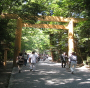 | 今年、伊勢神宮は二十年に一度の式年遷宮の年を迎えて、遷宮記念館も完成し、参道の鳥居や社殿の造営が進み、遷宮祭のクライマックス「遷御」を迎えようとしていた。そんな中、神宮参道の巨木巡礼では、予想にたがわず長い歴史を重ねた立派な神宮杉と出合うことができた。伊勢神宮の社殿の神明造は、古代の穀倉の形式から発展したといわれ、王子遺跡集落遺構で発見された棟持柱との共通性を認識し、王子集落遺構に見られる「棟持柱」を検証するいいい機会になった。 |