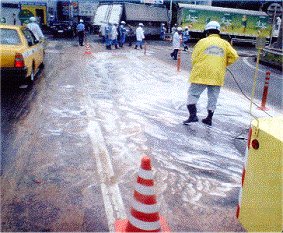 | (1)高圧スプレー洗浄機の場合 汚れの状態により、原液1gを10〜30倍に希釈しスプレーします。同時にロードクリーンエコを常温でも使用できますが、60℃ほどに加温し、圧力を10s f/Cu以上でスプレー洗浄すると汚れ落ちがよく、しかも早く落ちます。 ノズルの移動は舗装面内部まで洗浄剤を吹き付けて洗うような感じで、ゆっくりと移動して下さい。この後、水で濯ぎをして終了します。 (2)デッキブラシを使用する場合 5〜50倍に希釈した洗浄液を汚れ部分に散水しながら、デッキブラシで擦り洗いをします。 この場合も(1)と同じように舗装内部を擦るような感じで洗浄して下さい。この後、水で濯ぎをして終了します。 |
