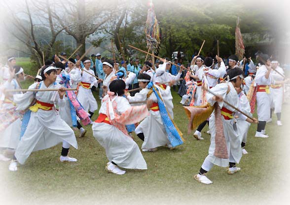 鹿屋市祓川の伝統行事「棒踊り」が桜満開の下で勇壮に踊られた。はじめに瀬戸山神社鳥居の下でに五穀豊穣・無病息災を祈願して奉納され、その後、近くの公園広場で上祓川、中祓川、下・西祓川の各地区の踊りの披露があり、最後は全体で各地区踊りの競演が行われ、盛り上がった。白装束に赤や黄色の色鮮やかな帯やたすきがけに白はちまきの出で立ちで威勢のいいかけ声とともに踊る姿は勇壮だった。踊りの起源については、封建時代、士農工商の身分制度が確立した後、刀を取り上げられた農民の志気を鼓舞するために棒踊りを始めさせたとも言われている。棒踊りの起源年代は異説はあるものの昔の踊りは、動作、歌曲ともに緩慢で薩摩人の気質にあわないので明治15年頃、テンポの早い踊り「武術(示現流の変形)をくずした踊りで勇壮なもの」を移入したのが現在まで継続されている。 2013年3月24日(日)