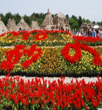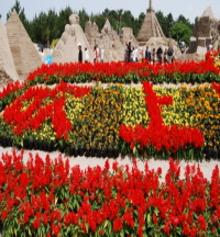 世界各地の遺産や自然を表現した数々の世界遺産の砂像を目の当たりにすると、悠久の歴史と先人達の英知が伝わってくる。国内外の招待作家等を中心に作成された砂像は、高さ約8mの巨大なティカル神殿を中心に、ボンペイ遺跡、ファラオ、アブ・シンベル大神殿など92基の砂像が並ぶ。制作日数約2週間、制作延べ約1000人、使った砂約2000立方メートル、使った草花約2万本。以下砂像のいくつかを紹介。 |