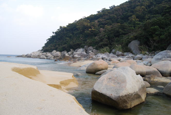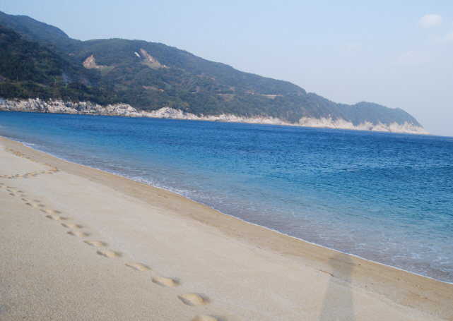 | 船間を過ぎて県道74号大浦線を南進すると辺塚に辿り着く。辺塚地区は三面を山で囲まれ、背地からは巨大な山が海岸線に沿ってなだれ込み、東方に向かって傾斜し、海に面している。平地は少なく船間から戸崎付近の丘陵を超えて辺塚に入るところに多少の平地があり、田畑が開けている。かつては陸の孤島と呼ばれた時代もあったが最近は交通網も整備され、利便性も増してきた。県道沿いの集落から、海岸に降り進むとギラギラする白い砂丘とコバルトブルーの海が目の前に広がり、壮観な太平洋が飛び込んでくる。山と海が織りなす手つかずの壮大な自然をここ、辺塚の海岸で目の当たりに見、体験することができる。辺塚海岸は海ガメの産卵地としても有名だ。探訪日 2009年2月12日 |