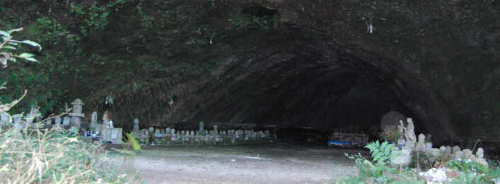 | 観音淵は地下水が長い年月をかけて造り出した天然の洞窟で、高さ8メートル、幅16メートル、奥行30メートルもあり、洞窟の中には、鎌倉時代初期から戦国時代までの供養塔が約90基ある。洞窟入口から見て右側の供養塔は、鎌倉初期にこの地方の開田作業を進めた富山一族の長谷三郎太夫義遠(はせさぶろうだゆうよしとお)一族及び、家臣団の逆修供養塔(ぎゃくしゅうくようとう)と見られる。左側の供養塔は肝付氏のもので、ともに鎌倉初期から富山氏と競って開田作業を進めたものと思われる。逆修供養塔とは、土地開発等の大事業や戦乱、または個人の意志により死後の安楽、極楽往生を願って生存中に建立する供養塔をいう。この観音淵中世古石塔群(かんのんぶちちゅうせいこせきとうぐん)は鹿屋市の指定史跡になっている(昭和56年8月19日指定)。観音淵洞窟から染み出る湧き水は名水として知られ、水汲みに来る人が多い。 最終探訪日/更新日 2014/05/09 |