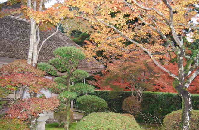 茶室と書院の様式を折衷した近世和風の茅葺き数奇屋建築の建物と色づいた紅葉 |