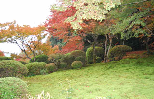 庭一面に絨毯を敷き詰めたかのような苔と色づいた紅葉、赤と緑の見事なコントラストが美しい。 |