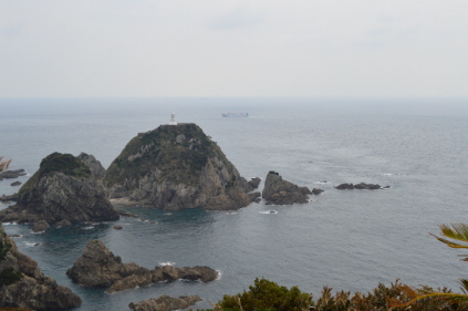 今も変わらない展望所からの風景<岬の沖にある大輪島にある白亜の日本最古の灯台>