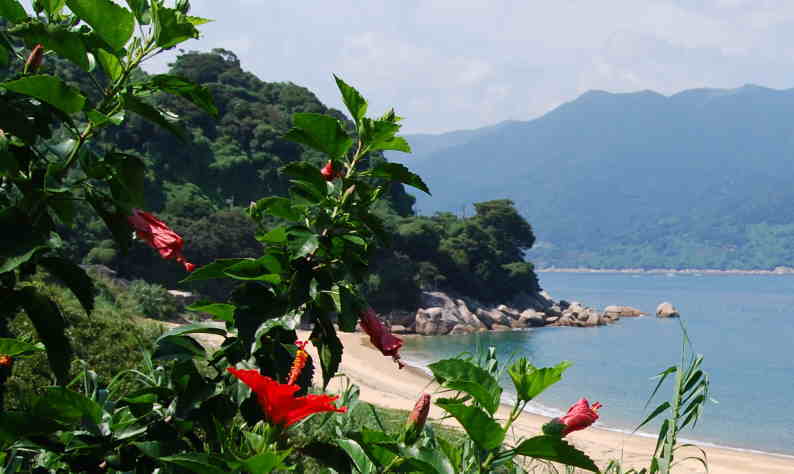 沿道から白木浜を望む。真っ赤なハイビスカスの花が南国の情緒を漂わせている。