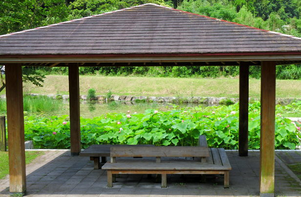 水辺の広場内にはかわいい木橋が架かり、屋根付きの東屋休憩所もある。 |