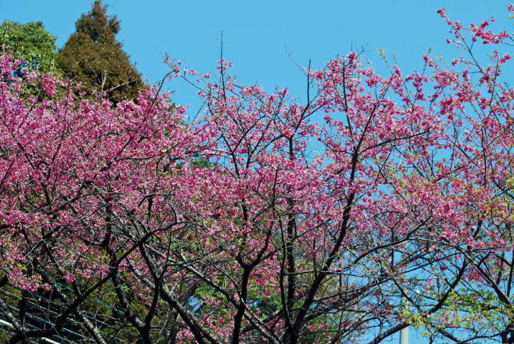 | ちょっと満開を過ぎたヒカンザクラに続き、淡いピンク色のカンザクラが花びらを大きく開き、見頃をむかえていた。甘い蜜を求めてメジロやヒヨドリの野鳥たちが枝から枝へ飛び交い、春本番の景観を呈していた。2月15日 |