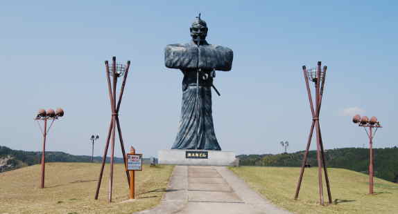 「弥五郎どん」のシンボル銅像。身の丈15m、重さが39tという巨大像で腰には9mと7mの太刀をさしている。 |