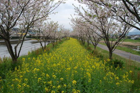 | 「吾平桜並木公園」は姶良橋から厚生橋付近までの堤防に沿って作られた約1.3kmの散歩コースでコースの片側が桜並木となっており、ソメイヨシノが約400本。桜と菜の花のコラボレーションが美しい。 |