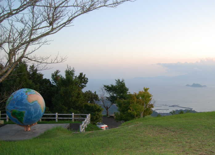 「陣岳交際の森」のシンボルになっている山頂付近の地球儀。遠方、志布志湾上に「枇榔島」が浮かぶ。 |