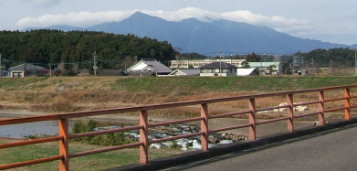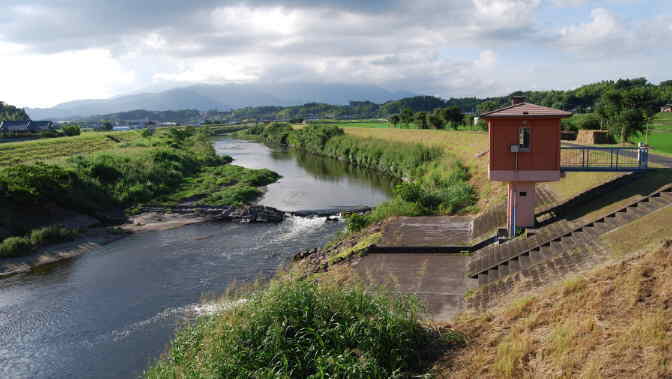 河原田橋付近の肝属川風景。橋上より上流方向の高隈山系を望む。 |