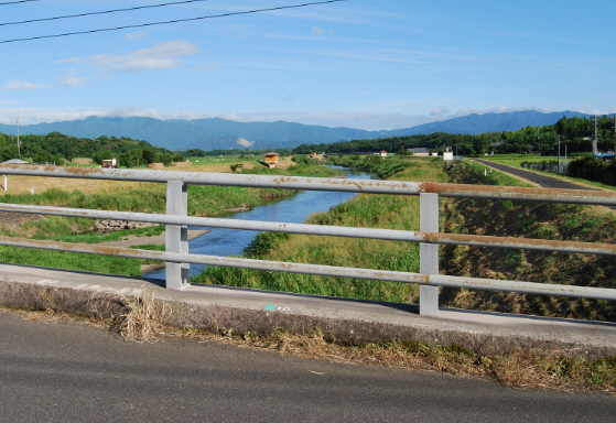 古い橋であるが橋の長さは142mもある。遠方建物は宮富小学校