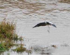 上流方向へ向かって飛び去るアオサギ。 |