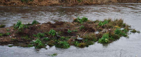 | 中州下流へ一羽のアオサギが舞い下りる。 |