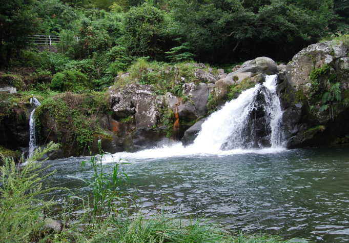 | 椅山(うるしやま)滝は、神ノ川上流,県道68号線沿いの錦江町半ヶ石にある。落差は5m前後、滝つぼは川幅全体に広がっている。落差はそんなにないが水量が多く、滝上部の狭い窪みから末広がりの直瀑となって勢いよく流れ落ちる様は迫力がある。滝上段にも落差のない岩間から流れ落ちる小さな滝と滝つぼがある。椅山滝一帯から下流数百メートルの左岸は断崖絶壁の渓谷が続き、一枚岩の岩盤が浸食された窪みや小さな滝が、美しい渓谷美をかもし出している。 |
