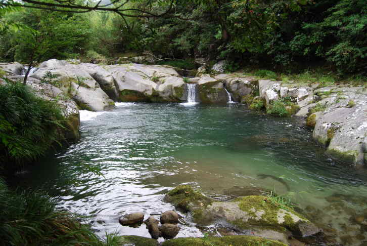 一枚岩の岩盤が浸食された窪みや小さな滝が、美しい渓谷美をかもし出している。 |