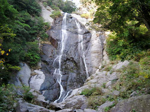 | 高須川の上流にある万滝は白滝とともに高隈山系を代表する滝のひとつだ。今回、横岳から万滝を巡るコースにチャレンジ。横岳から林道に下り立ち、高塚林道を左方向に万滝下降点を目指して進む。下降点から右手に沢音を聞きながら30分程歩いて万滝へ到着。河原に降り立つと、巨大な屏風岩を流れ落ちる滝が目の前にあった。滝は50m程の高さから二筋の見事な万の字を描いて流れ落ち、迫力ある滝だった。近くには白滝がある。 探訪日 2011/12/11 |
