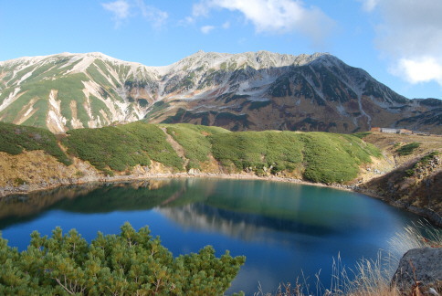 周囲の山並みを映し出すみくりが池:みくりが池は立山火山の水蒸気爆発によってできた火口湖でプランクトンやカワゲラの幼虫はいるが、魚はいない貧栄養型の湖沼であるという。 |