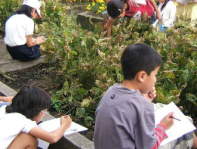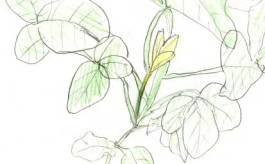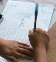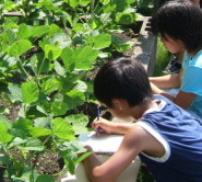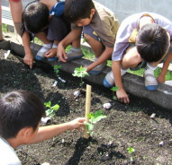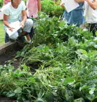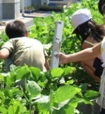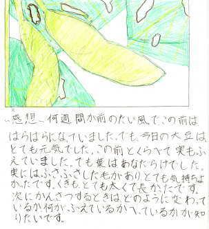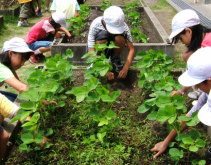 夏休み二回目の出校日、雑草ぬきの世話活動や成長の様子を観察しました。大豆はくきをのばし、葉がしげってしました。落花生は花をつけていました。へちまは花をたくさんつけ実ができていました。 |