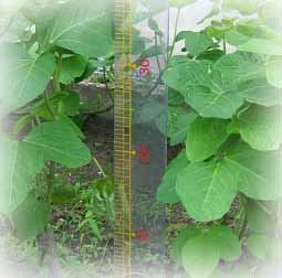 ○大豆のくきは50cm近くまで成長し、葉の数は60まいもついていました。くきも太くなりまだまだ成長しそうないきおいです。大豆さん、キラキラする夏の太陽の光をいっぱいあびてこれからもぐんぐん成長してね。