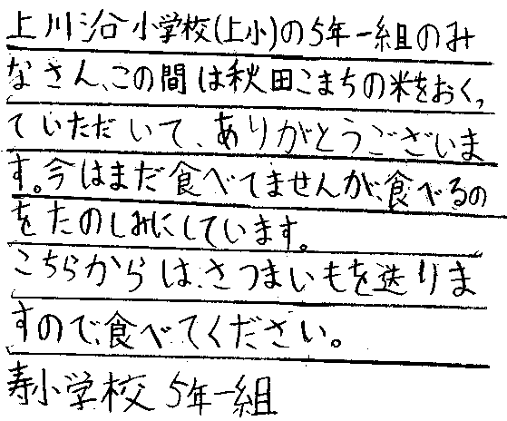 | 11月11日、上川沿小学校より「秋田こまち」の米とクラス全員の手紙が届く。 |