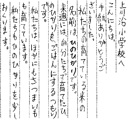 | 10月25日、寿小で育てたひのひかりの種もみ少量と返事の手紙を送る。 |