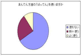 ○テレビドラマの「まんてん」で使われる鹿児島方言がマスコミで話題になっています。「ばってん」ということばがどれぐらい使われているかインタビュー聞き取り調査をして調べました。不特定多数の買い物客を対象にしたアンケートなので正確なデータは期待できませんが逆接の接続詞の意味で「ばってん」を使うと答えた人が17名いました。 |